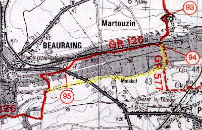 Continuer à monter avec le GR577 jusqu'à la sortie du bois. Là tourner à droite et suivre le chemin qui longe le bois. Ce chemin devient asphalté et passe au lieu-dit "Malakof". Traverser la N40 et continuer sur le chemin de terre en face jusqu'à retrouver une route et l'ancien tracé.