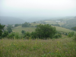 Je longe un bois, après la Croix du Pal, cela descend cette fois. Mais le brouillard aussi. Il est devenu perlant. Je suis trempé. Mais c'est beau, feutré, calme. Pour peu j'en redemanderais. Enfin voici Le Vassayre. Les indications du topo-guide sont bizarres mais je suis sur le bon chemin. Encore une draille pour éviter la D921 (mais quel détour !) et Laguiole apparaît enfin alors que le brouillard s'en va.