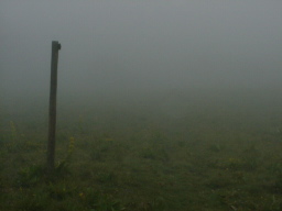 Le brouillard s'invite au Belvezet. Le Belvézet. Superbe vue sur la vallée alors que le brouillard s'empresse de tout recouvrir. Jusqu'à l'entrée de Laguiole il fera disparaître le paysage. Un moment, ne me demandez pas où, je marche avec le regard fixé à deux mètres devant moi pour ne pas perdre la trace d'un sentier devenu invisible et ne lève les yeux que pour tenter d'apercevoir une marque rouge et jaune. Sur ce qui est en hiver une piste de ski de fond, c'est pire qu'à Londres. Des poteaux distants d'une vingtaine de mètres. Je suis au premier, je ne devine même pas le deuxième. La boussole ? Et avec quels points de repère ? Je pense que, déserté par les skieurs, ce plateau ferait une excellente pâture. Un poteau ? Non ! Une Aubrac. Bonjour madame la vache. Quel est le plus étonné des deux ? Moi. C'est à peine si elle détourne la tête pour me voir m'éloigner. Mais où est la barrière ? Que je sorte d'ici !