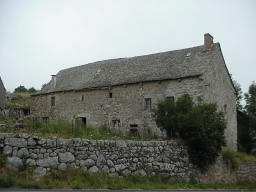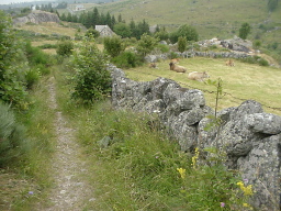 Recoule d'Aubrac. Une maison abandonnée comme tant d'autres. Après 5,5 km j'enjambe le Bès pour la première fois de la journée. Toujours l'asphalte ! Sauf pour une courbe surréaliste d'une centaine de mètres qui ne fait même pas oublier le goudron encore visible à travers les maigres buissons. Enfin un plateau où le chemin se perd sous les fleurs. Malgré le temps tristounet, on n'entend que les oiseaux dont le chant est porté par le vent froid. Deux bonnes heures d'un calme parfait entre les petits murets de pierres. Si le soleil était là ... Surprise: deux ânes et un cheval. Qui disait qu'il n'y avait que des vaches par ici ?