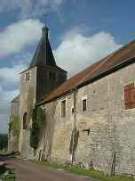 Châteauneuf: l'église Il est facile de rejoindre le canal. Il suffit de se laisser descendre en suivant les lacets gravis hier sous un soleil de plomb. Pendant quelques temps il faudra encore longer l'autoroute dont le bruit monotone remplit la vallée. Enfin Crugey. On passe pour la dernière fois sous le tablier de l'autorute. Il est si bas qu'un joueur de basket pourrait presque le toucher en sautant.