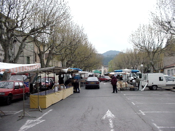 Le marché, avant les acheteurs. Oh, c'est haut. Mais on gagne 300m. La route s'éloigne et le sentier grimpe lentement sous les arbres. En contrebas, on devine les cerisiers alignés comme à la parade et dont les fleurs blanches font les yeux doux au soleil. Sans résultat, malheureusement. Inutile de pousser le regard très loin. Beaumont-du-Ventoux reste invisible et profite, timide, de la couverture du brouillard pour échapper à nos yeux. Et ça grimpe, encore et encore. Le sentier se fait plus étroit, par moment ça glisse.