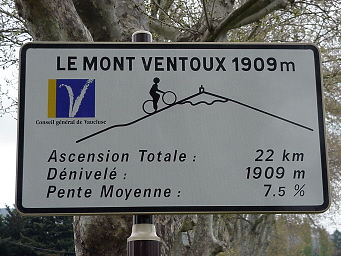 Nous quittons Malaucène alors que le marché hebdomadaire finit de s'installer et que chaque marchand cherche encore à trouver la bonne place. Au sortir du village, un panneau annonce la couleur pour les cyclistes: dénivelé: 1909 m, pente moyenne 7,5%. Voudrais pas être à leur place. Mais il y en a qui aiment ça au point d'avoir créé une association pour les courageux qui le font trois fois dans la journée ... Il y a même un diplôme de galérien pour la 4e ascension cycliste.