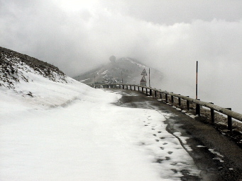 Tout commence "à l'aise", sous les arbres encore hauts, mais le ton est donné. Des lacets, des lacets et encore des lacets. La récompense en en haut, en alternance ... La neige apparaît, timide au début. Quelques longues tâches blanches qui s'accrochent au chemin. Le décor change, autour de nous les nuages emballent tout, au gré du vent. Parfois le soleil les déchire et on peut alors deviner les pentes qui nous font face. Le sentier devient plus clair, les arbres plus petits. Il ne manque au sapin que la guirlande pour se croire à Noël. Et puis plus de sapin du tout. De la caillasse, avec parfois la tache colorée d'une fleur, parfois les traits blanc et rouge qui tracent le GR. L'observatoire répète son entrée en scène à chaque lever du rideau de brume. On croise la route, fermée aux voitures. On repart sur le sentier. C'est le dernier morceau. Tout est nu. Par beau temps la vue doit être magnifique. Aujourd'hui, nous on se la joue feutrée, magique, changeante, presque mystérieuse. Le temps de se retourner et le sommet d'en face n'est plus qu'un souvenir.